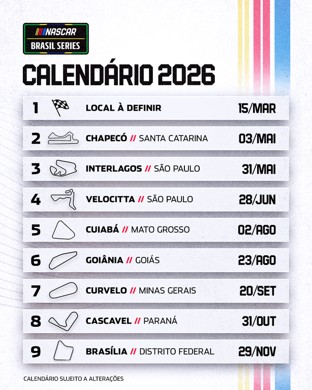 Curvelo, Cuiabá, Brasília e Goiânia serão palcos das quatro etapas realizadas em ovais ou traçados externos em 2026 — uma das grandes novidades da próxima temporada da NASCAR Brasil Series. Outra mudança significativa será a adoção do sistema de playoffs, que promete elevar ainda mais o nível de disputa na reta final do campeonato.